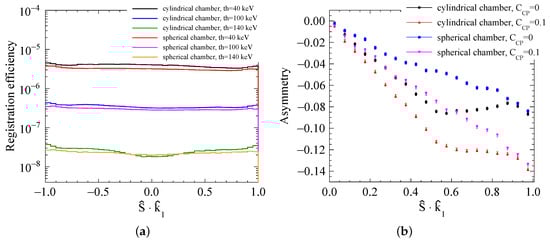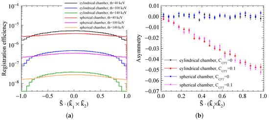 (a): Total efficiency of registration ortho-positronium (o-Ps) events in J-PET as a function of the angular correlation obtained in a MC simulation. The curves present efficiencies in the case of two different geometries of the positronium production chamber: cylindrical and spherical as well as for three values of energy deposition threshold for single detection. (b): Asymmetry of the distribution for the two chamber geometries in cases of no CPT violation and an exaggerated violation at the 10% level assumed in the simulations.