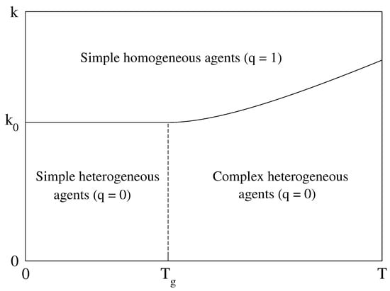 Hence there are actually three different regions in the phase diagram shown in Figure 1. For and , agents have no preferred configurations and visit many different configurations over time. For and , each agent spends a lot of time in a small set of preferred configurations. In other words, agents look simple, but they remain different one from the other. This regime is dominated by agent heterogeneity, and there is on average no macroscopic overlap between agent configurations (). In the last region , the coupling between agents dominates over agents heterogeneity, and all agents are essentially in the same configuration, leading to a strong overlap () and to the emergence of a common characteristic, a phenomenon that has been called standardization in [].