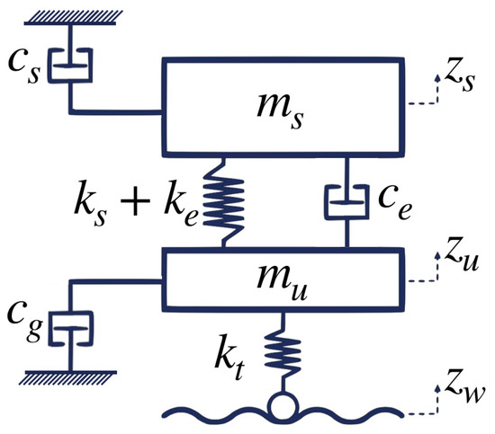 where , and denote the car body vertical displacement, the wheel-axle vertical displacement and the road disturbance, respectively, is the stiffness of the suspension spring, is the tire stiffness, is the passive stiffness of the damper, is the passive damping of the damper, is the field-dependent controllable damping force, is the damper time constant and is the control input.