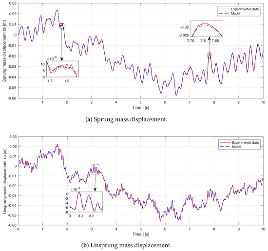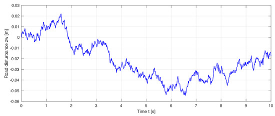 Table 3 shows the selected numerical values for the suspension model and control parameters. Figure 7 shows the random road perturbations’ profile. The experimental validation results in the time domain are presented in Figure 8.