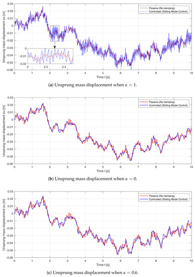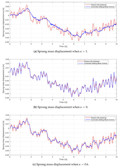 The simulation results of passive and controlled displacements of both sprung and unsprung masses are presented in Figure 9 and Figure 10 for comparison. Three different control cases were considered for three different driving characteristics, namely for full ride comfort (i.e., = 1), full road-holding (i.e., = 0) and proportionally both ride comfort and road-holding (i.e., = 0.6). It can be observed from Figure 9 and Figure 10 that, in the case when the sliding mode control for ride comfort is effective (i.e., = 1), the sprung mass vibrations decrease significantly, while the unsprung mass vibrations increase (i.e., road-holding deteriorates). In contrast, when the sliding mode control for road-holding is effective (i.e., = 0), the unsprung mass vibrations decrease significantly, while the sprung mass vibrations increase (i.e., ride comfort deteriorates). When the sliding mode control applies for 60% ride comfort and 40% road-holding (i.e., = 0.6), both sprung and unsprung mass vibrations proportionally decrease. This reflects the real physical trade-off between the road-holding and ride comfort driving characteristics.