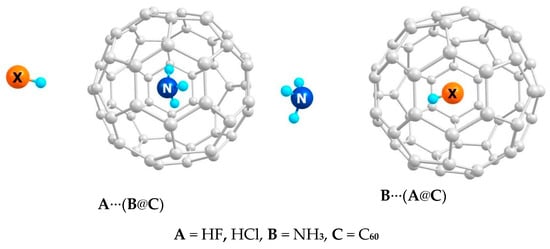 Consider a computational example of the inversion in a cage isomerism of three-component molecules composed of an acid A = HF or HCl, a base B = NH3, and a cage C = C60 (Figure 1). Encapsulation of HF and NH3 in C60 was already achieved with the molecular surgery i.e., synthesis of an open-cage fullerene and placing HF or NH3 inside and closing the cage [61,62,63,64,65]. For HCl, analogous synthesis seems to be feasible as well [66,67,68,69]. Although the XH⋯NH3 complex is likely to be stable in the C60 cage [70], here, we focus on the ic isomerism rather than on the A, B, C system in full generality.