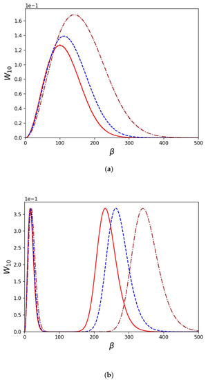 Figure 2 shows that as the field amplitude increased, the maximum that was at β = (100–150) in Figure 2a disappeared and became the minimum. Two new maxima appeared: one at β << 100 and the other at β > 200. The distance between the two maxima increased with the increasing magnitude of the chirp and of the field amplitude.