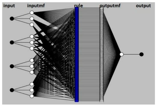 ANFIS is a fuzzy model used as a method of constructing rule systems, by entering the data of the prediction model to derive more efficient membership functions. The membership function parameters are tuned with the use of methods based on ANNs, as ANFIS is a type of adaptive network that functions as a fuzzy system. The structure of this model is shown in Figure 1 and it is composed of four inputs, hidden layers and one output datum. The nodes of each level were connected to each other through links that indicated the direction of the information of the neural network.