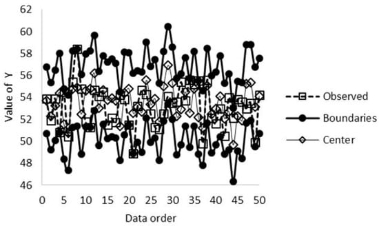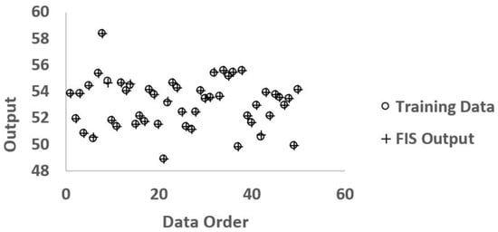 The estimation of 50 sets of the 28-day compressive strength of cement was analyzed by using two fuzzy methods: fuzzy linear regression and ANFIS. The results of these methods are reported in Table 3 in order to compare the two fuzzy models. According to the results, the fuzzy linear regression and ANFIS methods successfully predicted the compressive strength of cement with small deviations. The data, which were obtained from a previous study [], had a limited range of values and led to reliable predictions of the observed cement strength just within the aforementioned range. However, the purpose of the model is to apply and control input parameters in more favorable experimental conditions in order to provide the cement compressive strength with higher accuracy.