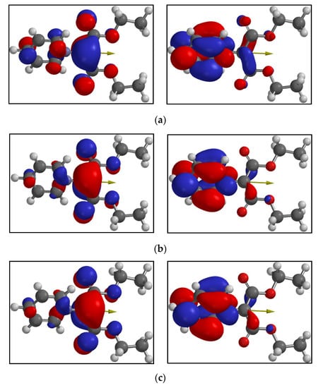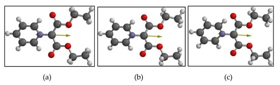 The places of nucleophilic attack (located near carbanion and near the two oxygens of C=O groups of carbethoxy substituents) can be observed in Figure 4a–c for PCCM in vaporous phase, or in solutions in water and ethanol, respectively.