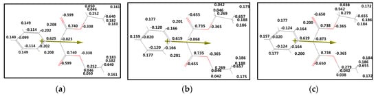 Atomic charges near the atoms of PCCM in (a) vaporous state and in solutions with (b) water and (c) ethanol.