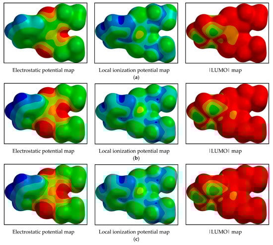 Electrostatic potential map, local ionization potential map, and |LUMO| map of PCCM in (a) vaporous phase, (b) water, and (c) ethanol.