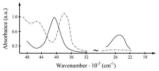 The solvent influence on the visible band of PCCM was explained both by using empirical parameters introduced by Kamlet Taft [] and also by using Relation (2), derived by the theory of diluted solutions developed by McRae [], Bakhshiev [], Abe [], and others, in the hypothesis that only long-range (universal or non-specific) interactions determine the spectral shifts. In this case, the influence of the specific interactions is taken into consideration by two empirically introduced terms in Relations (1) and (2).