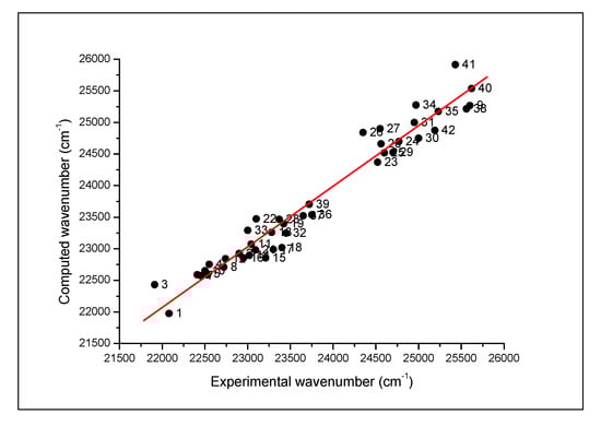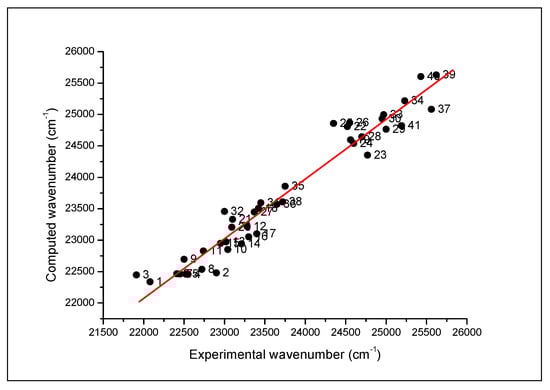 Computed wavenumber with Relation (10) and data from Table 2, (cm−1), vs. experimental wavenumber, (cm−1).