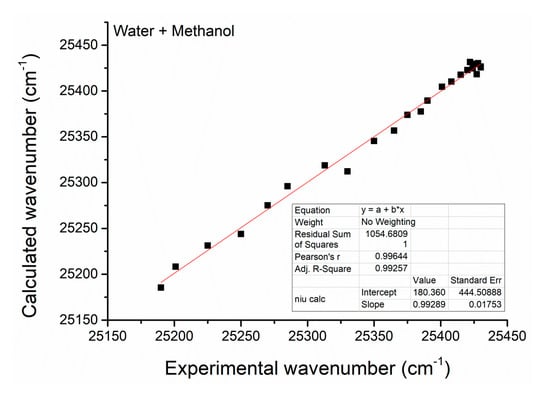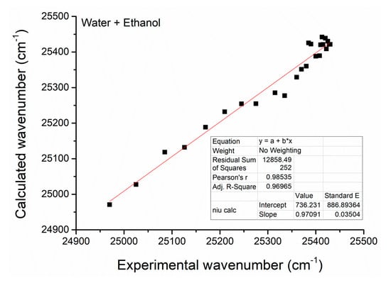For this reason, Relation (2) was also applied to the spectral data given in Table 2, because the correlation coefficients, C1 and C2, are expressed as function on the molecular parameters of the spectrally active molecule [,] and offer the possibility to characterize the excited state of this molecule, as it results from Relations (3) and (4). The correlation coefficients obtained based on Relation (2) and the data from Table 2 are listed below. The results of statistical analysis of spectral data based on Relation (11) are illustrated in Figure 7, in which the computed values of the ICT wavenumbers are plotted vs. those experimentally obtained.