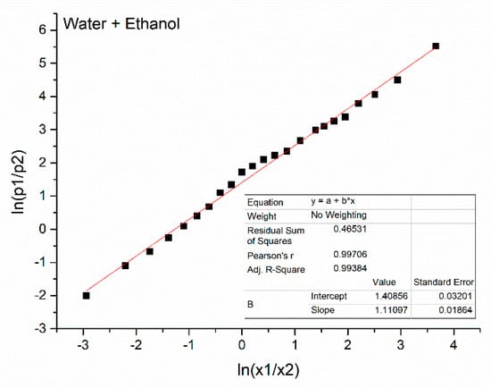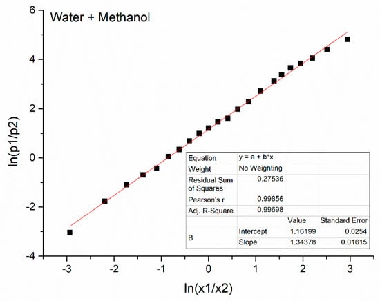 The difference between the interaction energies in the molecular pairs of the types PCCM–water (1) and PCCM–ethanol (2) and, respectively, PCCM–Water (1) and PCCM–Methanol (2) was estimated based on the significance of the cut at origin of the corresponding lines (see Figure 10 and Figure 11).