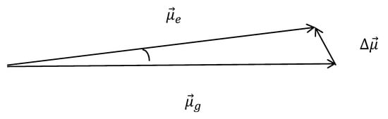 In Table 7, only some of the estimations are listed, because for φ = 8.5°, the value of the excited state polarizability equalizes the ground state polarizability, and one can appreciate that the electronic transition with ICT takes place at this angle. The results obtained when the dipole moments triangle (Figure 12) was solved are , Δµ = 1D, φ = 8.5°, for initial values , computed by Spartan for PCCM in water; and (for cyclohexane); and C1 = 1642 cm−1 and C2 = −261 cm−1. In Figure 12, the angle between the ground state dipole moment and the vector Δµ is 59.72 degrees, and the angle between the excited state dipole moment and the vector Δµ is 111.78 degrees.
