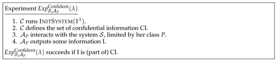 This notion is linked to attacks aiming at retrieving confidential information. An example of such a situation is a hospital using IoT for medical follow-up. The system is composed of (1) a centralized backend containing the medical data of all the patients; (2) IoT wristbands that are worn by the patients during their stay at the hospital; and (3) IoT tablets that scan the wristbands and provide to the doctors the medical data related to the corresponding patients. In this example, an adversary may want to retrieve the medical data of the patients wearing an IoT wristband. The confidentiality experiment is described in Figure 1.