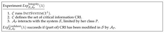 This notion is linked to attacks aiming at modifying (e.g., adding, changing or removing) part of the critical information contained in a system. Following the hospital example, an adversary may want to erase data of some patients, preventing them of being treated. The integrity experiment is described in Figure 2.