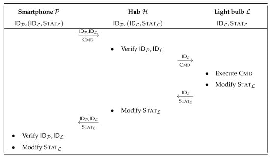 An adversary can try to modify the status of a light bulb without the knowledge of the user, and thus desynchronise this information in . To do so, she must be active and perform a man-in-the-middle attack to prevent the command message to be received by the light bulb. To formalise this attack, let us consider the class. The attack performed by on during is as follows.