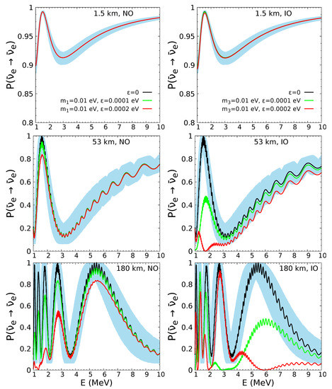- Since is very small when compared to , the term in second part of Equation (38) becomes negligible as compared to two other terms containing and , respectively. As a result, the second part of Equation (38) in the case of NO () is always smaller than that in IO scenario (). Therefore, we expect the modification in survival probability due to non-zero to be smaller when the mass pattern is NO than that for IO.