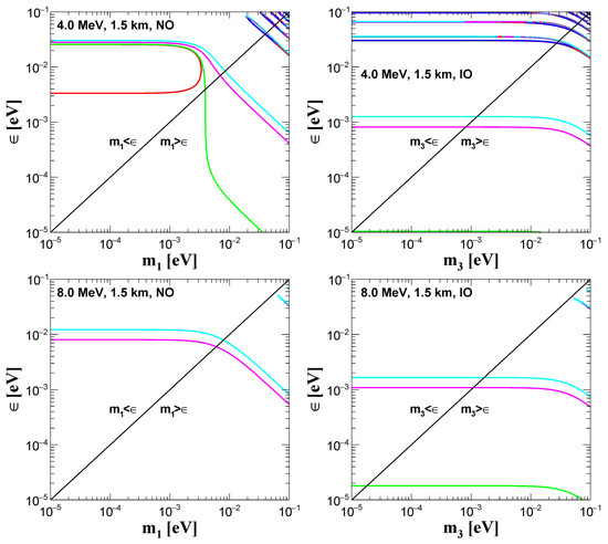 Figure 2 presents the allowed region in the plane of lightest Dirac mass and which we obtain following the above mentioned method for 1.5 km baseline and two fixed energies 4 MeV (top panels) and 8 MeV (bottom panels) for demonstration purpose. We present these limits with benchmark values (green line), (pink and red lines) and (cyan and blue lines) allowed range of oscillation parameters. The limits in the case of IO (right panels) is more stringent than that for NO (left panels) for both of the energies due to a larger effect of in survival probabilities for IO, which is explained in Section 4.