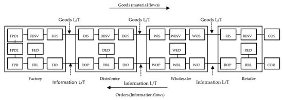 Supply chain management (SCM) is defined as a way to maximize profitability while keeping the overall cost of the supply chain to a minimum and meeting the customer’s service requirements at the same time. SCM is described as a systematic method that can be used to effectively integrate suppliers, manufacturers, distributors, and retailers so that an optimal product can be delivered in optimal amounts, at an optimal location, and at the optimal time []. The most ideal supply chain is the symmetric chain in which the product quantity, equal to the order quantity of the tier, is transferred from the upstream tier to the downstream tier. However, information sharing is not enabled and shows asymmetric results that differ between input and output values. Supply chains are complicated systems, involving, for example, demand handling, lead-times, batch orders, payments, price changes, and promotions []. This means that unexpected problems can arise. The most prominent of these is the “bullwhip effect”, whereby errors in demand forecasts increase along the supply chain [].