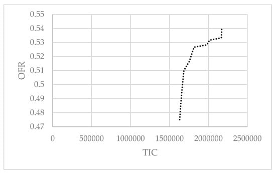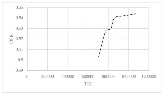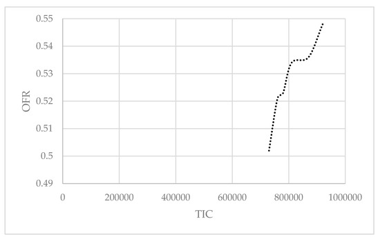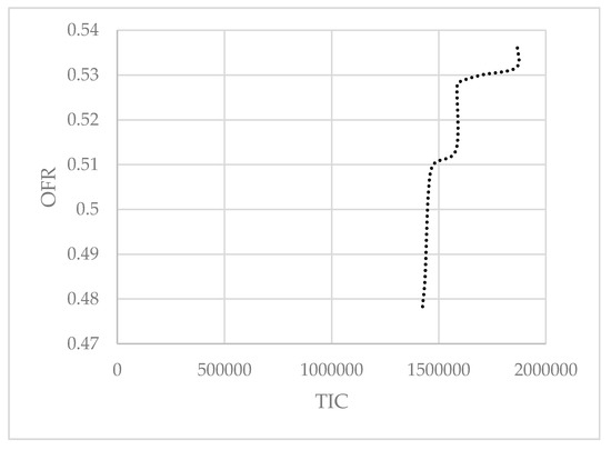 As shown in Table 1, the TIC, by adjusting from 0 to 1, was between 1,424,416.167 and 1,866,388.589, and the TIC, when was set to 0.25, was between 1,630,458.682 and 2,170,367.994. The range of OFR, when has a constant value of 0.25, was 0.475 to 0.54, and the range of the OFR, by adjusting from 0 to 1, was 0.478 to 0.537.