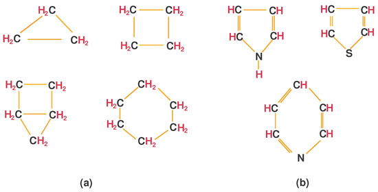 • Cyclic compounds are molecules consisting of closed chain (ring) of at least three carbon atoms. If the closed chain has only carbon atoms, then it is an organic cyclic molecule that is called by homocyclic compound. If the closed chain has both carbon and non-carbon atoms, then it is an inorganic cyclic molecule that is called the heterocyclic compound. Moreover, Cycloalkanes ( C n H 2 n ) are the isomers of alkenes consisting of exactly one cyclic compound joined by a single bond. Figure 6a,b presents the cyclic compounds (homocyclic and heterocyclic, respectively).