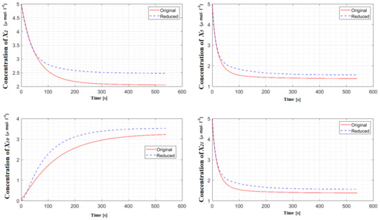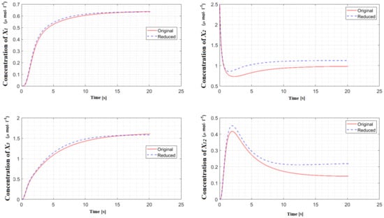 There are nine reversible and two irreversible reactions in the original network. The complex graph corresponding to the original network is given in the left-hand panel of Figure 3. The concentrations of the important species participating in the original model are represented in Figure 4. We observe that it contains two linkage classes consisting of more than one reaction. The remaining six linkage classes consist of only one reversible reaction. In this case, the reduction method proposed in [5] can be meaningfully applied to delete four intermediate complexes, namely, , , , and . Further reduction using the same procedure would lead to the deletion of reactions, which is not desirable in the sense of preserving the original behavior. However, the use of our new approach results in a meaningful reduction without causing a significant change in the original behavior. Detailed explanation of the species elimination procedure is included in Appendix A.2.