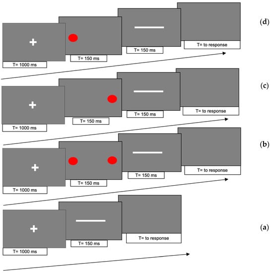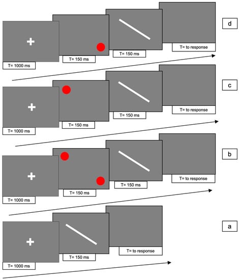 For conditions 2, 3 and 4, each trial consisted of the following 4 phases: (i) t the beginning of each trial, a white fixation cross was presented at the centre of the screen for 1000 ms; (ii) immediately after the cross had disappeared, two (for condition 2) or one red dot(s) (for conditions 3 and 4) were presented for 150 ms; (iii) immediately after the disappearance of the dots, the white line was presented for 150 ms; (iv) after the disappearance of the bar, a gray screen appeared, which was visible until the participant responded.