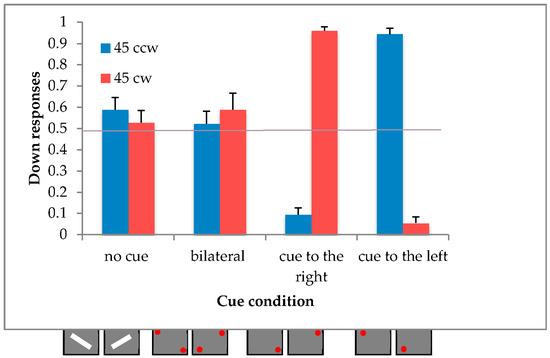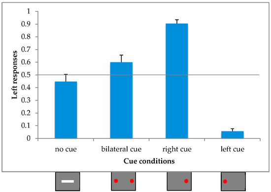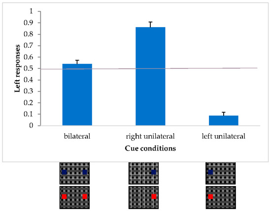 17], we found an asymmetrical effect in the symmetrical bilateral cue condition. In particular, the proportion of leftward responses was higher than for the simple line condition, denoted by a bias to the right.