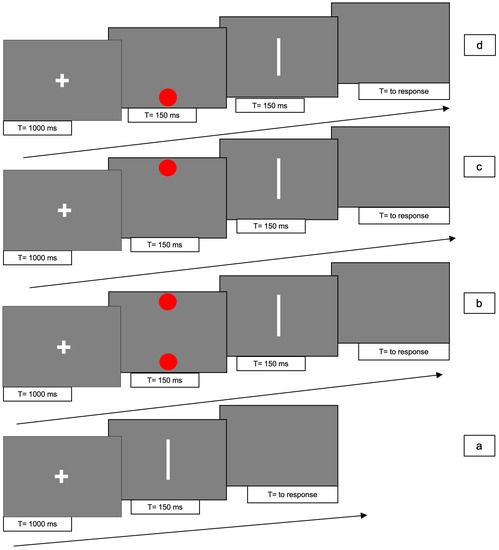 For conditions 2, 3 and 4, each trial consisted of the following 4 phases: (i) at the beginning of each trial a white fixation cross was presented at the centre of the screen for 1000 ms; (ii) immediately after the cross had disappeared, two (for condition 2) or one red dot(s) (for conditions 3 and 4) were presented for 150 ms; (iii) immediately after the disappearance of the dots, the white line was presented for 150 ms; (iv) after the disappearance of the bar, a gray screen appeared, which was visible until the participant responded.