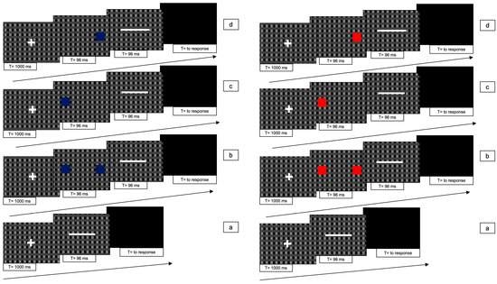 One or two red (RGB = 95,0,0; colorimetric values: x = 0.644, y = 0.328) or blue squares (RGB = 0,0,100; x = 0.147, y = 0.067) could appear (1.7° × 1.7°) at a distance of 1° from the position of the line ends. The luminance of the cues was set at 0.4 cd/m2; this value was equated to the average luminance of gray flickering background (RGB = 77,77,77; luminance range = 0.7–0.12 cd/m2). Luminance and colorimetric parameters were measured by a photometer (Konica Minolta CS-100 Spot Chroma Meter; Konica-Minolta, Tokyo, Japan).