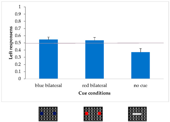 Firstly, in order to confirm the presence of the pseudo-extinction effect, the no-cue condition was compared with both bilateral cue conditions. A within-subjects ANOVA was carried out with the 3-levels factor condition (no-cue condition, blue bilateral cues, red bilateral cues). The dependent variable was always the proportion of leftward responses.
