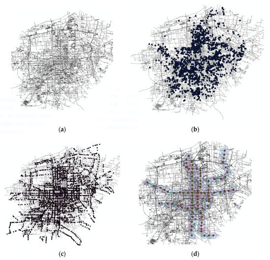 Data spatial distribution in Xi’an, China. (a) Urban road network spatial distribution. (b) Housing spatial distribution. (c) Bus spatial distribution. (d) Metro spatial distribution.