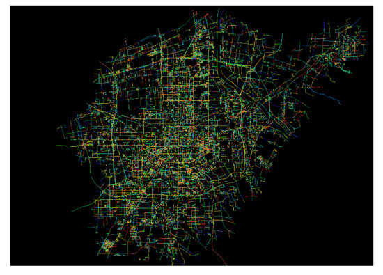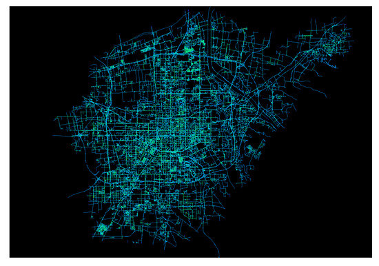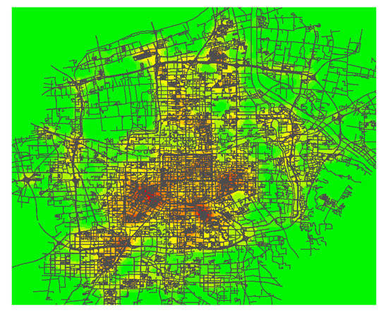 In Figure 5, the accessibility under the highest radius of Pearson correlation coefficient is selected, and the best search radius for pedestrian accessibility is determined as = 1600 m. Figure 6 shows the axis diagram under space syntax calculation when = 1600 m. The pedestrian accessibility under this radius is retained as the optimal pedestrian accessibility feature of the house. Figure 7 shows the heat distribution map of Xi’an road network axis and pedestrian accessibility when the search radius is = 1600 m.