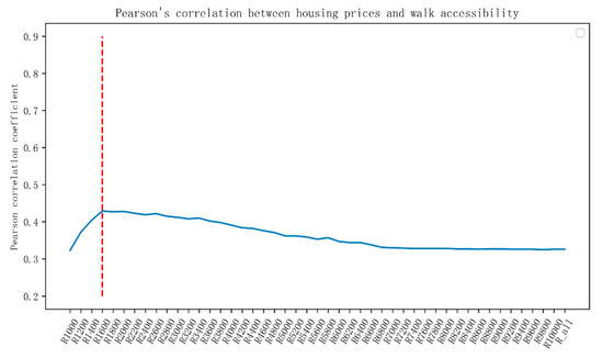 In the above calculation, there are several groups of walking accessibility values under different search radius, so it is necessary to determine the optimal search radius. In this paper, the Pearson correlation coefficient between house price and walking accessibility is calculated to judge, and the highest coefficient is selected as the best search radius and walking accessibility. In statistics, Pearson correlation coefficient is used to measure the degree of correlation between two groups of variables [32]. The calculation formula is shown in Equation (2). Figure 5 shows Pearson correlation coefficient between house price and pedestrian accessibility based on spatial syntax under different radius of pedestrian accessibility.