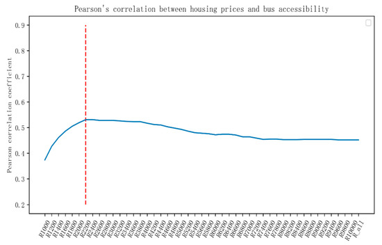 Pearson correlation coefficient graph of house price and bus accessibility under different radii.