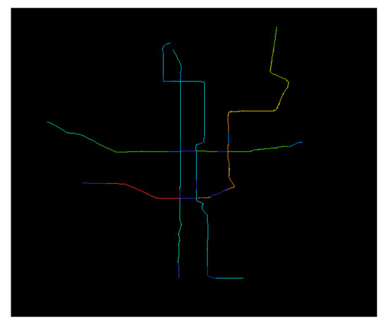 In Equation (4), represents the metro accessibility of node , represents the running distance between two metro stations, and represents the number of metro stations in the road network. refers to the number of transfer lines at station .