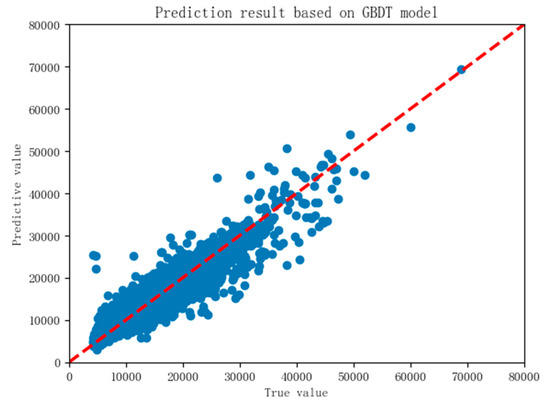 In Figure 14, scattered points are basically distributed along the middle line, showing a “shuttle” shape, which shows that GBDT algorithm can make a good prediction of house price. However, from the perspective of model accuracy, GBDT is not as good as RF in predicting housing prices.
