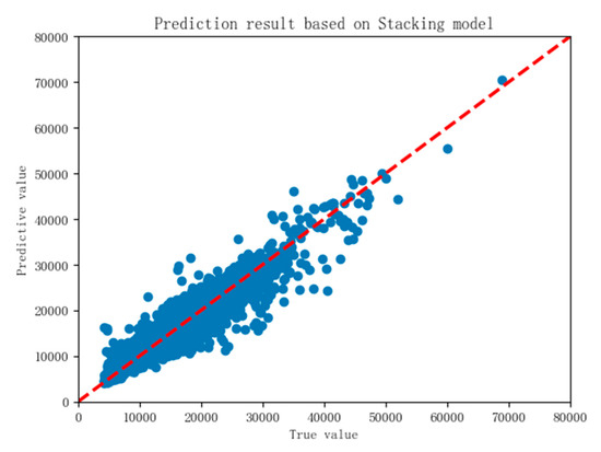 In Equation (7), represents the housing price predicted by the Stacking algorithm, represents the predicted value of RF model, represents the predicted value of GBDT model, and represents the predicted value of LGBM model. In the formula, the input features have the same dimension, so their coefficients can be considered as the proportion of each model in the Stacking algorithm. The model is used to predict the test set data. The forecast results are shown in Figure 16 below, where the R²score is 0.892 and RMSE is 1761.84.