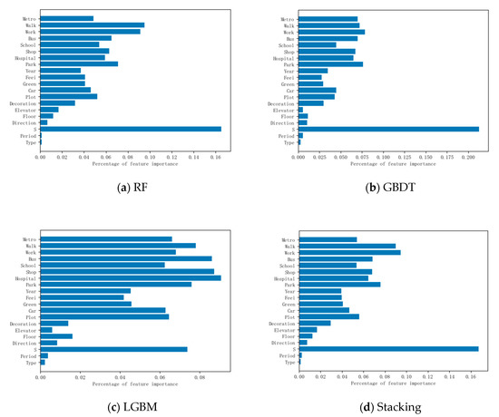 It can be found from the characteristic importance proportion in Figure 17 that in the four models, the importance proportion of house area is the largest. In addition, the traffic factors, which are composed of road network accessibility, bus accessibility and metro accessibility calculated by spatial syntax, also account for a large proportion of the importance of the model. After statistics, the proportion of traffic factors in the four models is 21.043%, 20.71%, 22.04%, and 21.68% respectively. This shows that in the housing price analysis, traffic has a great influence on the housing price, which is one of the important factors that cannot be ignored.