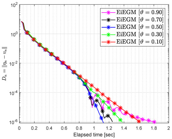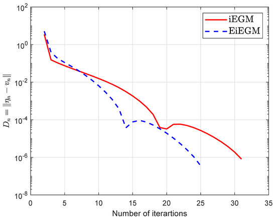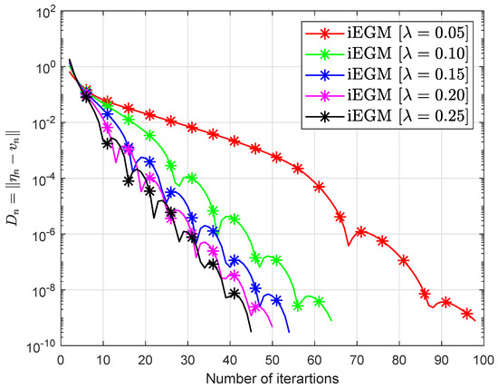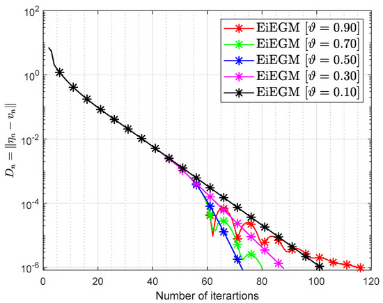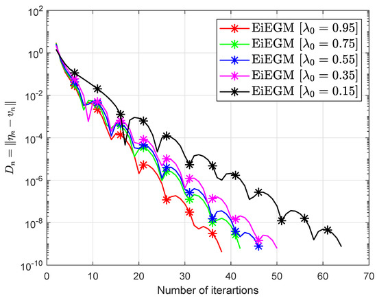 We can see in [48] that K is monotone and Lipschitz-continuous with a Lipschitz constant of . Figure 9 and Figure 10 and Table 6 show the numerical results by choosing different values of and