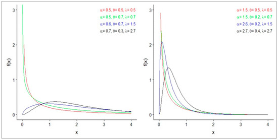Since is negative, the is “concave” for all and 1. As a result, is “log-concave” and “unimodal”. Additionally, the PDF (2) can be written as