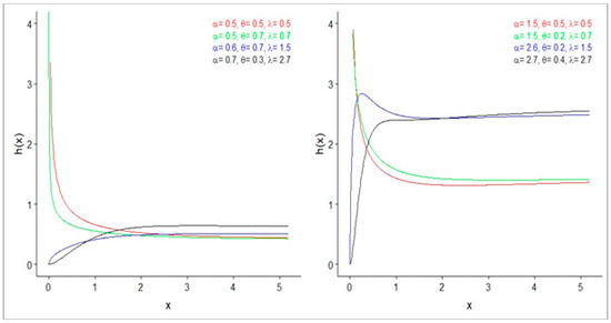Figure 2 gives the plots of the HRF of the EBE distribution. We note that the new HRF can be “increasing”, “increasing-constant”, “decreasing” and “upside-down-constant” shaped. Thus, the new model may be useful in modeling different shapes of real data.