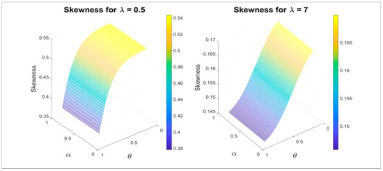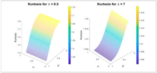 If we set , we obtain the mean of the EBE distribution. Variance, skewness and kurtosis measures can be easily derived from the well-known relationships. Three-dimensional plots of the skewness and kurtosis of the EBE model are presented in Figure 3 and Figure 4. □