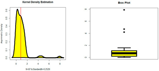 The following real data set represents the stress-rupture life of Kevlar 49/epoxy strands that are subjected to constant sustained pressure at the 90% stress level until all have failed that were provided by [24], given as 0.01, 0.08, 0.09, 0.09, 0.10, 0.02, 0.02, 0.03, 0.03, 0.04, 0.05, 0.43, 0.52, 0.54, 0.56, 0.60, 0.60, 1.00, 0.06, 1.34, 0.10, 1.45, 1.50, 1.51, 0.63, 0.72,0.99, 1.52, 1.53, 1.54, 1.54, 1.55, 1.58, 4.20, 4.69, 7.89, 0.07, 0.07, 0.36, 0.38, 0.40, 0.65, 0.67, 0.68, 0.79, 0.80, 0.80, 0.83, 0.72, 0.42, 0.12, 0.13, 0.18, 0.19, 0.20, 0.23, 0.24, 1.01, 1.02, 1.03, 0.72, 0.73, 0.79, 0.85, 0.90, 0.92, 0.95, 1.05, 0.11, 0.24, 0.29, 0.34, 0.35, 1.10, 1.10, 1.11, 1.15, 1.18, 1.20, 1.29, 1.31, 0.11, 0.01, 0.02, 1.40, 1.43 and 1.33. Table 7 gives the MLE for all the models corresponds to the failure times data set. Table 8 shows the statistics for the failure times of the Kevlar data set. Figure 5 gives the kernel density estimation and box plot for exploring the symmetry of the stress-rupture life data. Figure 6 provides the fitted PDF in the left panel and fitted CDF in the right panel.