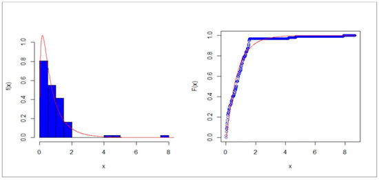 Fitted PDF (left panel) and fitted cumulative distribution function (CDF) (right panel).