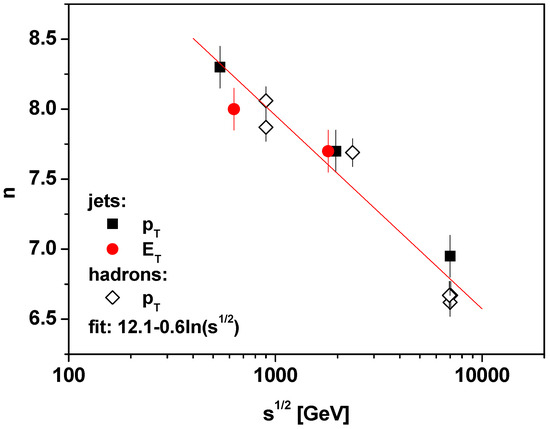 The slope parameters n extracted from the fits by Equation (1) to the transverse spectra of jets [24] (full symbols) in comparison with the slope parameters for distributions of charged particles [22] (open symbols).