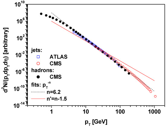 Comparison of power indices n for jets with those for charged particles produced in minimum bias collisions is shown in Figure 1. The values of the corresponding power indices are similar, indicating the existence of a common mechanism behind these processes [24]. The suggestion that power indices for jets are almost 2 times smaller than those for hadrons [21,22] comes mainly from a different parameterization of hadrons and jets spectra (not a simple Tsallis distribution) and corresponding distributions are very similar at the high limit, see Figure 2.