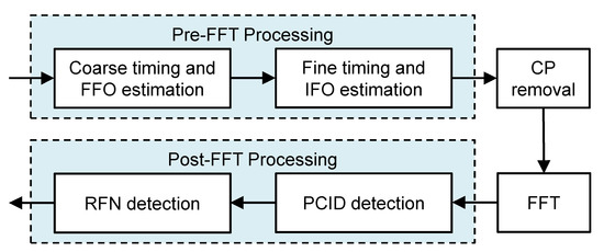 where is the Integer CFO (IFO) normalized by subcarrier spacing , is the Fractional CFO (FFO) normalized by , is the integer-valued Symbol Timing Offset (STO), is the complex channel gain, ⊗ is the linear convolution operator, and is the zero-mean AWGN with variance . At the receiver, the CFO denoted by can be decomposed to an integer part and a fractional part, leading to . Throughout this paper, the notation stands for the estimated value of parameter x. During initial timing and frequency detection procedure, the STO estimate and the CFO estimate are estimated and recovered from the received signal [15,16]. After performing initial time and frequency synchronization, there remain Residual CFO (RFO) and Residual STO (RTO) denoted by and , respectively. After removing the CP and taking the FFT operation, the FFT output at the k-th subcarrier during the l-th OFDM block is expressed as [18,19]: