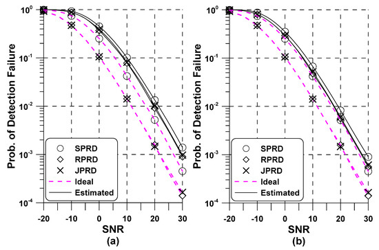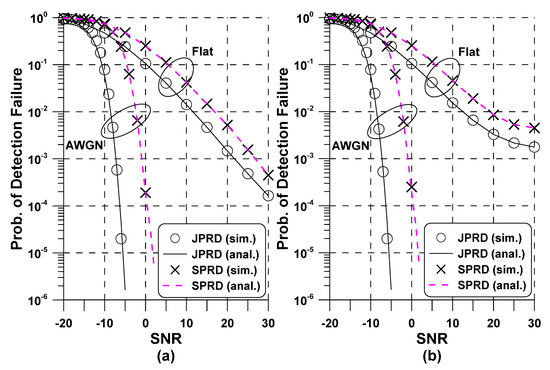 Figure 3 presents of the proposed NSSS detection method in AWGN and flat fading channels. To verify the accuracy of the performance analysis, we considered the scenario where the STO was completely estimated at the pre-FFT synchronization step. As benchmark, the probability of detection failure of the JPRD method Equation (29) is also provided. The first behavior we observe from Figure 3 is that the simulation result (marker) exactly coincided with the theoretical analysis (line) in both AWGN and flat-fading channels. Although not shown in this figure, analytical curve of the RPRD method was the same to that of the JPRD method. As predicted, the presence of channel fading and RFO substantially deteriorates the accuracy of the JPRD and SPRD methods. In particular, the RFO caused an irreducible ICI as the SNR increased, leading to error floor phenomenon as observed in Figure 3b. Compared to the JPRD approach, it can be seen that the SPRD approach suffered from some performance loss, showing the performance versus complexity tradeoffs. This phenomenon is attributed to the reason that squaring operation in Equation (11) increased noise variance of the proposed SPRD method.