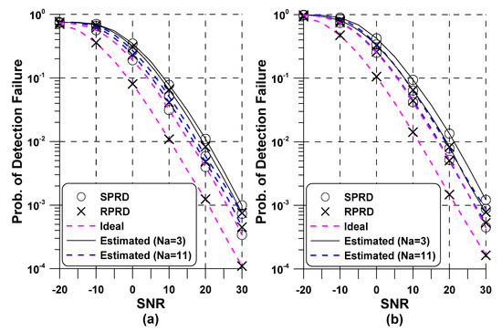 which requires 4032 hypotheses. The other was a reduced-complexity PCID and RFN Detection (RPRD) method presented in [16], which can be viewed as a low-complexity version of the JPRD method and is based on the same observation as Equation (28). For both approaches, the estimated PCID was , while an RFN was obtained by combining and . Comparing Equations (17) and (28), it was observed that was statistically equivalent to . Thus, the probability of detection failure of the JPRD and RPRD methods could be expressed in an identical form to Equation (27) replacing 7 with 4031.